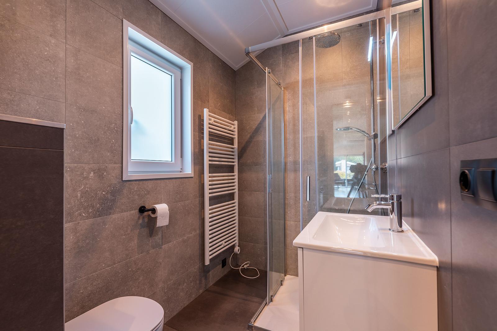 De badkamer is uitgerust met een wasmeubel, douche en toilet.