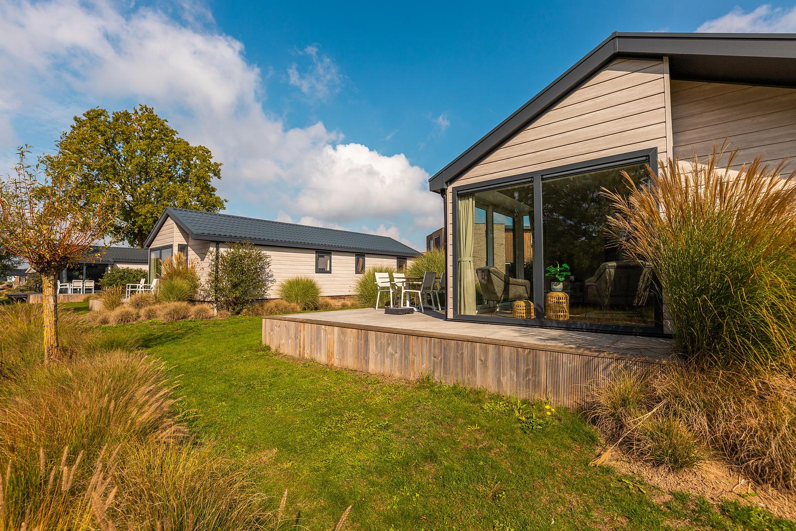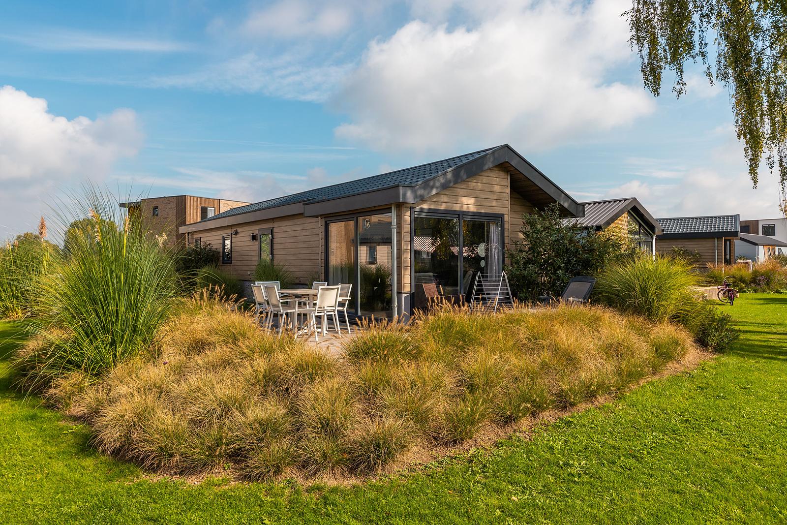 De vakantiewoning ligt op een mooie hoekkavel en heeft een ruim verhoogd terras.